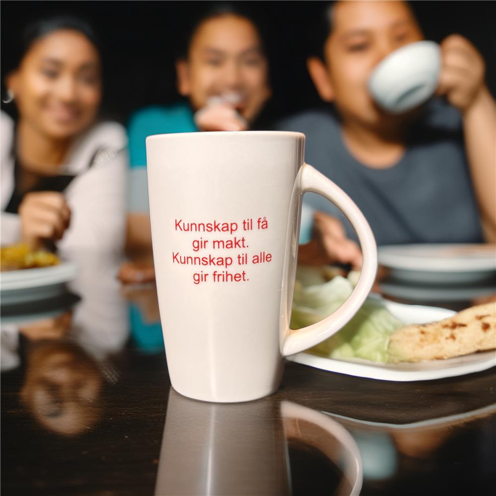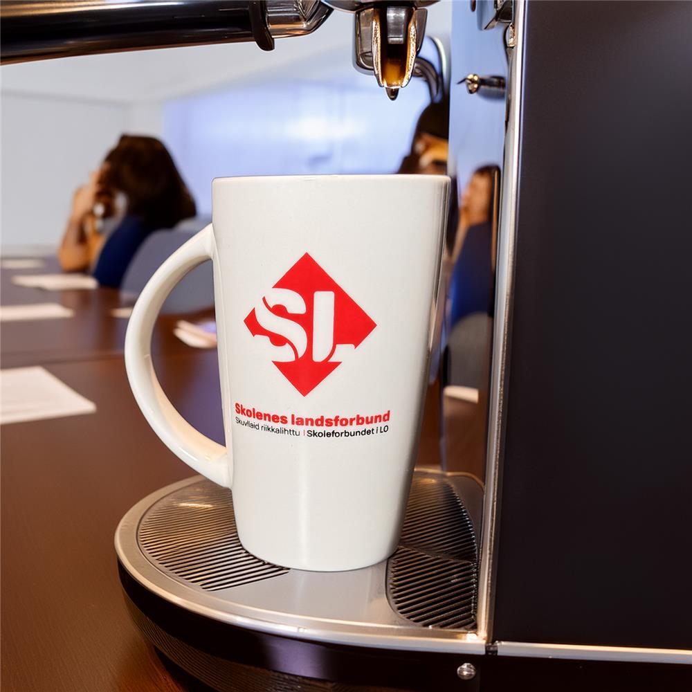 Kopp med SL-logo og slagordet «Kunnskap til få gir makt. Kunnskap til alle gir frihet». Perfekt kopp for å synliggjøre SL på arbeidsplassen. Størrelse: 0,2 liter